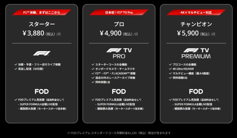 FOD F1のプランには、スターター、プロ、チャンピオンと3つのコースが準備され、プロとチャンピオンコースには、FOD F1プランの最大の特徴であるF1公式のストリーミングサービス『F1 TV』と連携できることになっています。