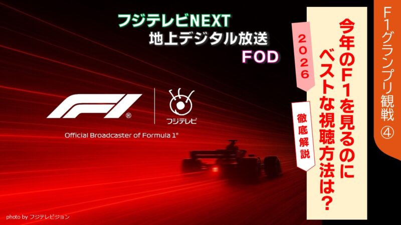 2025年12月現在でFODに関する発表はなされていないため、おそらく地上デジタル放送以外は、どのサービスでも全戦、全セッションが放送されると思われます。CS放送のフジテレビNEXTは、2026年も間違いなく全戦、全セッション放送されるでしょう。